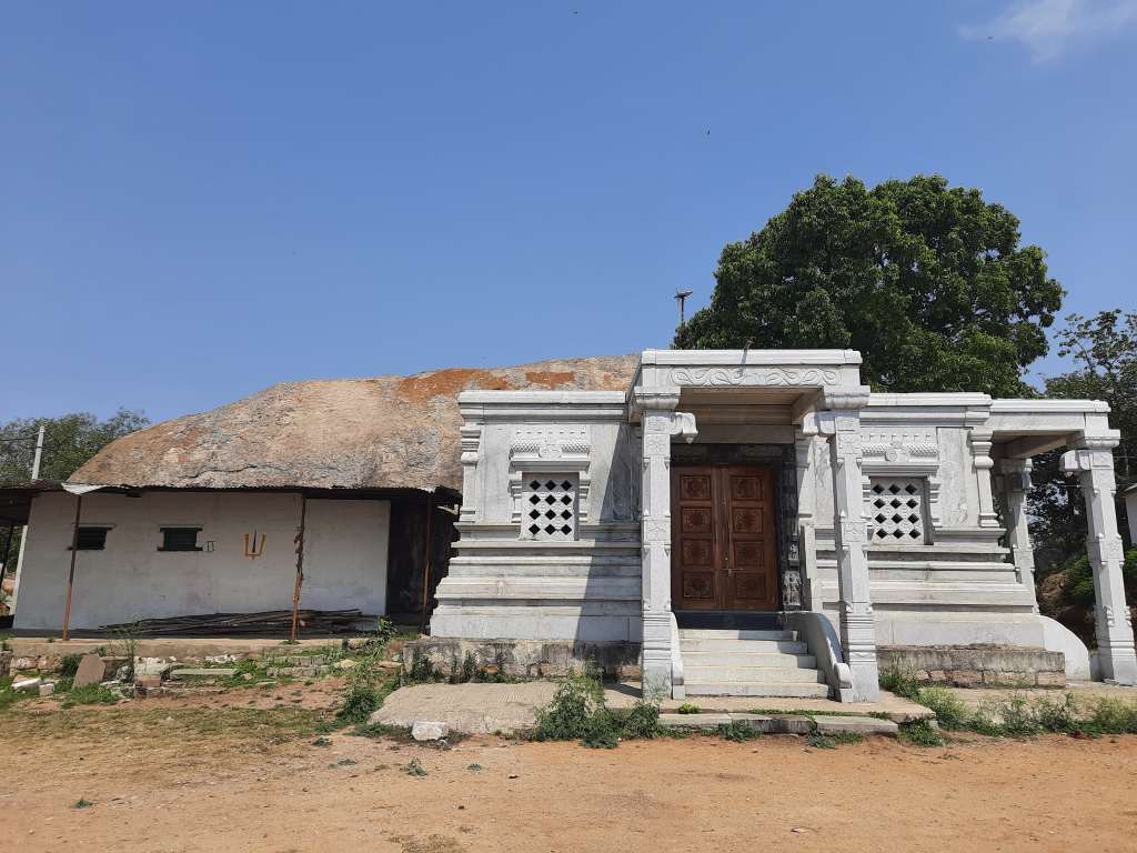 Upon reaching the peak, it was a large open area which came as quite a surprise. While one side of the hill had the temple pond dug into the edge of the rocky hill, the main temple of Ranganathaswamy is located on another side of the hill, overseeing a magnificent view of the surrounding hills. The main deity is carved out of a large monolithic rocky outcrop on the hill, which makes this place unique among all that I had visited thus far. There is a small sculpture on this rock which we were told is the original figurine of worship until it was damaged many years ago. Since then, an alternate idol has been carved out of the larger rock and a simple temple has been built outside leading into the prayer chamber within the monolithic rock.