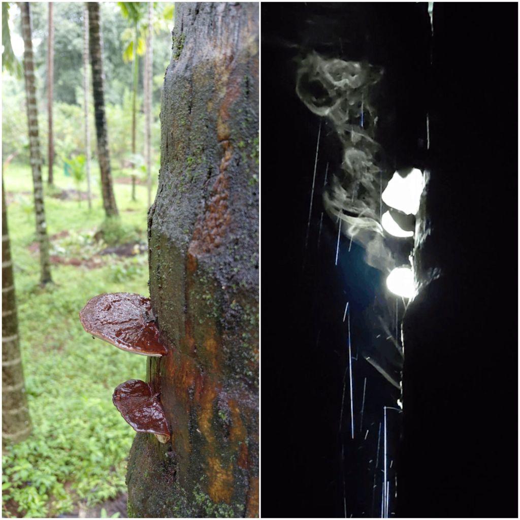 We then walked through the exit door on the back side, passing by a series of bathrooms where we could hear the water in the firewood-lit boilers. As rain-fed streams came to life while walking through their rubber plantation, we crossed a little river to arrive at Datta-Gufa, a family-maintained temple. This is an important temple in the village accessible from the main road as well, but we were more privileged to get private access from the other side. After spending time on their property, we returned to the homestay from where we took our bike and commenced our return ride towards Colva.