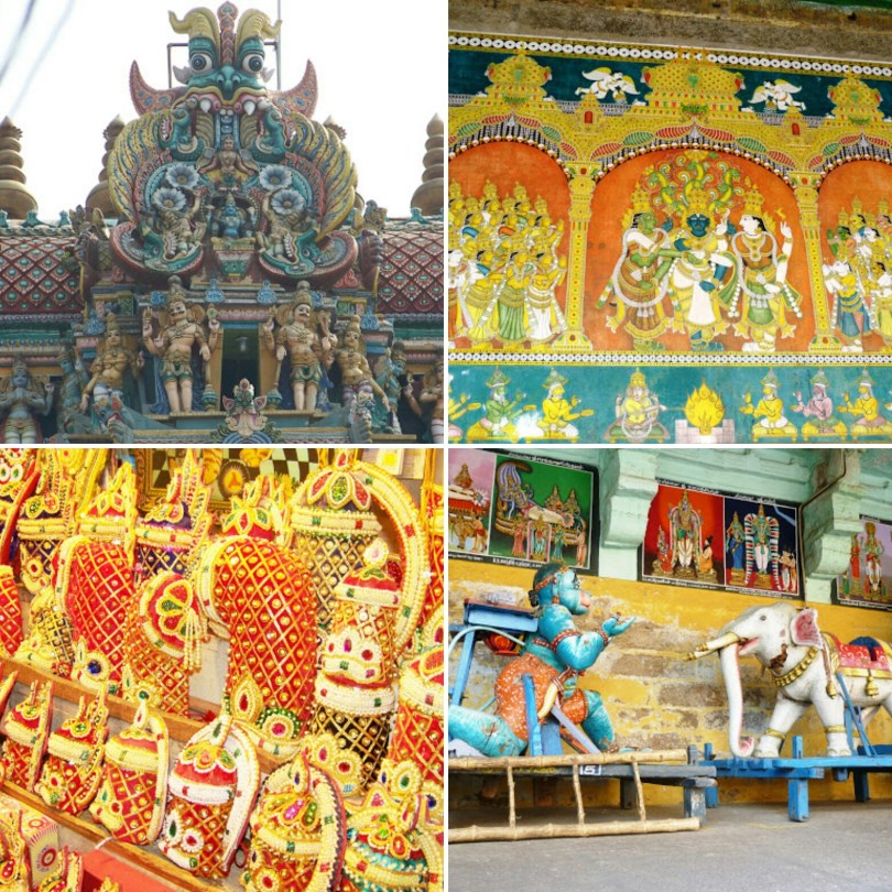 Clockwise from top left: 1.The sculptures on the western tower of the Meenakshi temple; 2.One of the mural paintings from the temple walls; 3.The wooden carriages for the temple idols; 4: Handicrafts from the temple stalls