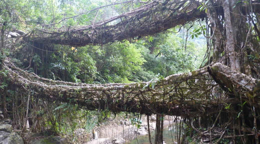 A pleasant drive through the breathtakingly beautiful valleys and naturally formed creepy high limestone walls brought us to a village called Tyrna in Cherrapunjee. That’s where the tarmac ends and our car had to be parked. Further, we trekked down to the Nongriat village: where the ‘Umshiang bridge’ or popularly called ‘the double decker root bridge’ exists. One needs to climb over 2500 steps each way, so that this piece of marvel can be seen at close quarters. Root bridges are created by inter-weaving the roots of the rubber tree by the tribal folks who live in the deep forests of Meghalaya for their local commute across the bloated rivers during monsoon. A bridge fit for usage can take a minimum of a couple of decades and it only gets stronger with age. There are several such living root bridges across Meghalaya and most of them continue to be untouched by the tourists due to their remoteness. We were here, to tread on some of the most popular living root-bridges of Meghalaya.